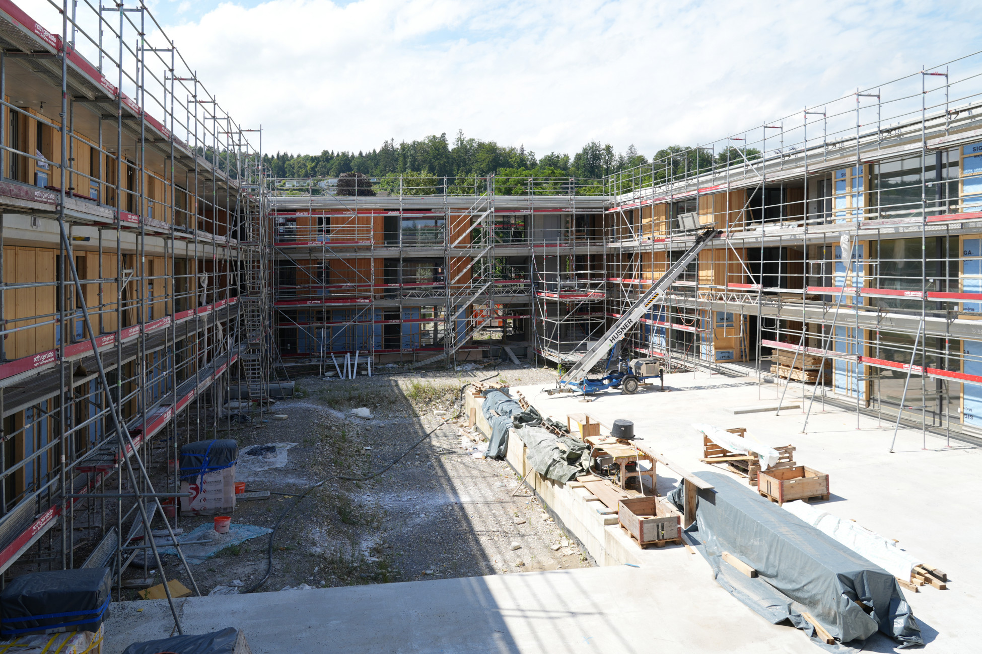HUSNER umhüllt den Massivbau mit einer vorgehängten, hinterlüfteten Holzfassade. Auf die Unterkonstruktion in Schweizer Holz montiert HUSNER 2100 m2 strukturgehobelte Nut- und Kamm-Bretter. Jedes der fünf Häuser wird mit einer anderen Holzart bekleidet: Douglasie, Fichte, Föhre, Lärche und Tanne. Damit differenzieren sich die Gebäudetypen auch optisch; das Holz verleiht jedem Haus den einzigartigen Charakter. Warm und einladend harmonieren die verschiedenen Hölzer mit der naturnahen Umgebung und schenken der Überbauung eine freundliche, einladende Optik. Durch die vorgelagerten Laubengänge bleibt das Holz witterungsgeschützt, so dass das Holz nur mit einem farblosen UV-Schutz behandelt wurde.