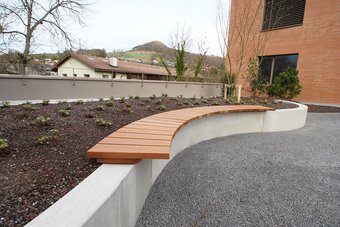 Terrassenboden inkl. seitliche Abschlüsse, Geländer und Tritt aus Thermokiefer.