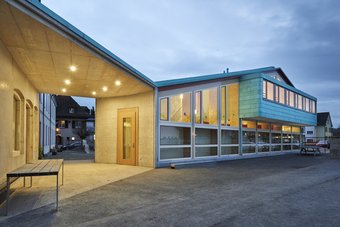 Kronenartig bilden zwei Holzbaukörper das Obergeschoss mit beidseitig belichteten Klassenzimmern. Schulgeschoss, Wände und Dach in Holzelementbauweise. Hinterlüftete Lächernholzschalung unsichtbar montiert.