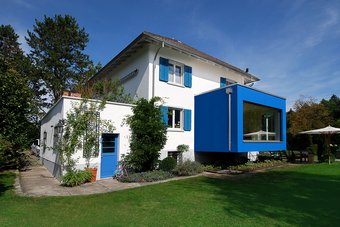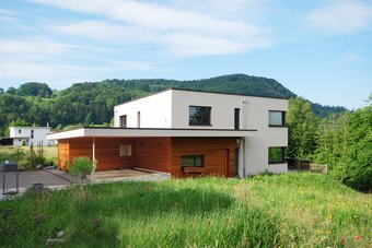 Verstärkung des Bestandes für Durchbruch. Anbau EFH in Holzelementbauweise. Hinterlüftete Fassade mit vorvergrauter, horizontaler Rhomboid-Schalung mit Effektlasur in 3 unterschiedlichen Bretterbreiten.