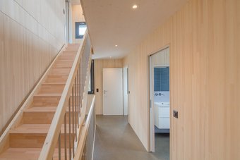 Innenausbau: Wohnräume mit Akustikdecken von Lignotrend. Sämtliche Decken und Holzoberflächen weiss lasiert.