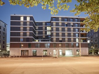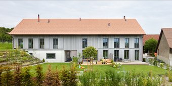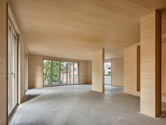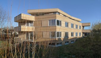 Dreigeschossiger Holzelementbau in U-Form mit 55 Mietwohnungen und Doppelkindergarten.