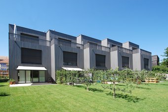 Dreigeschossige Hybridbauten. Sämtliche Aussenwände und Attikageschoss in Holzelementbauweise. Hinterlüftete Fassade mit grossformatigen Faserzementplatten. Wände im Attikageschoss teilweise mit Altholz verkleidet.