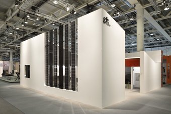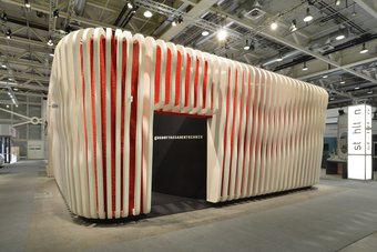 Unterkonstruktion in Holz, Fassade aus schwarzen Keramikplatten, Öffnungen in Dreiecksform. | Swissarchitects.com definierte den Stand zum Schönsten an der Swissbau 2016.
