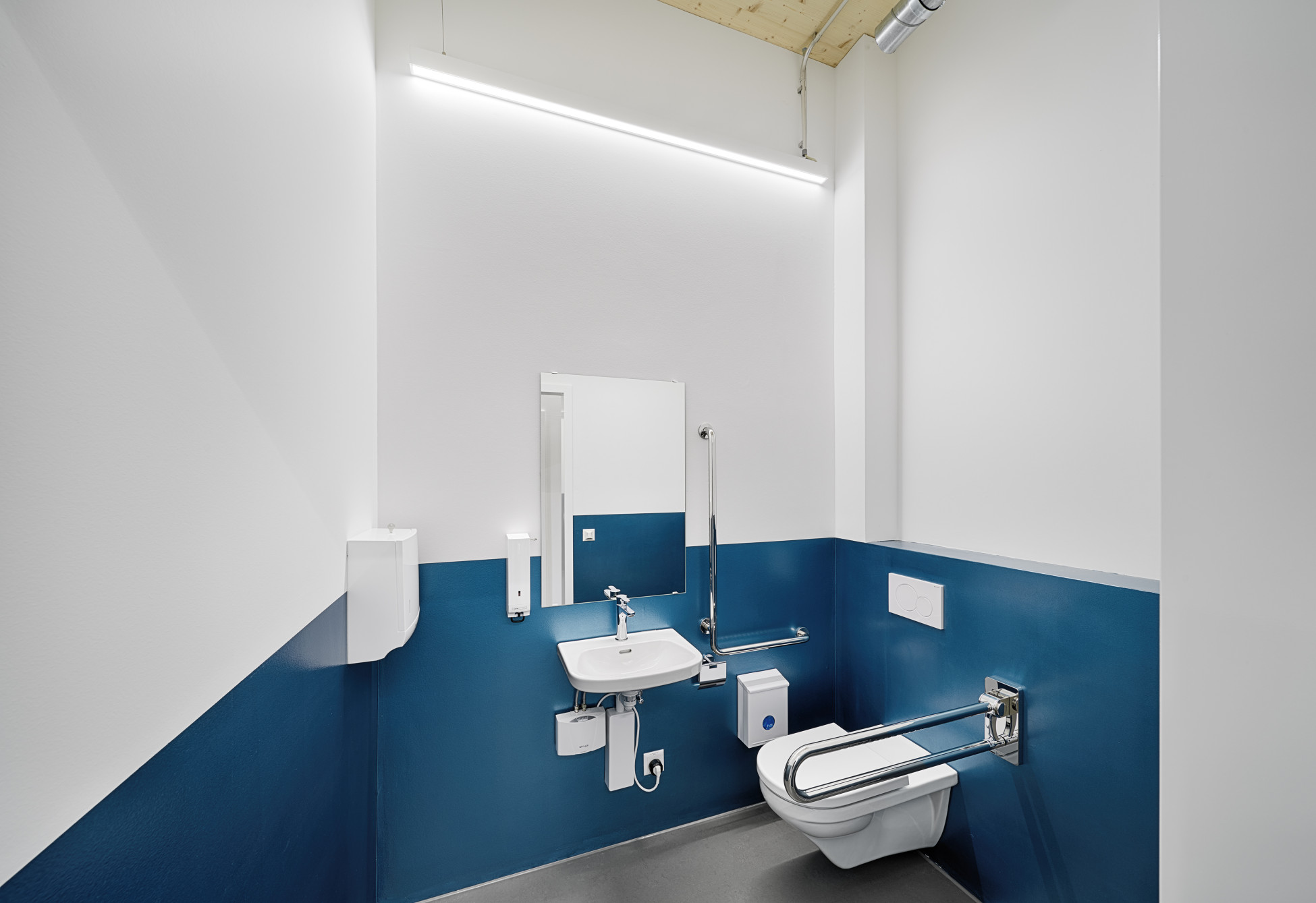 Eingeschossiges Logistikgebäude in Holzelementbauweise. Hinterlüftete vorvergraute Fichtenschalung.