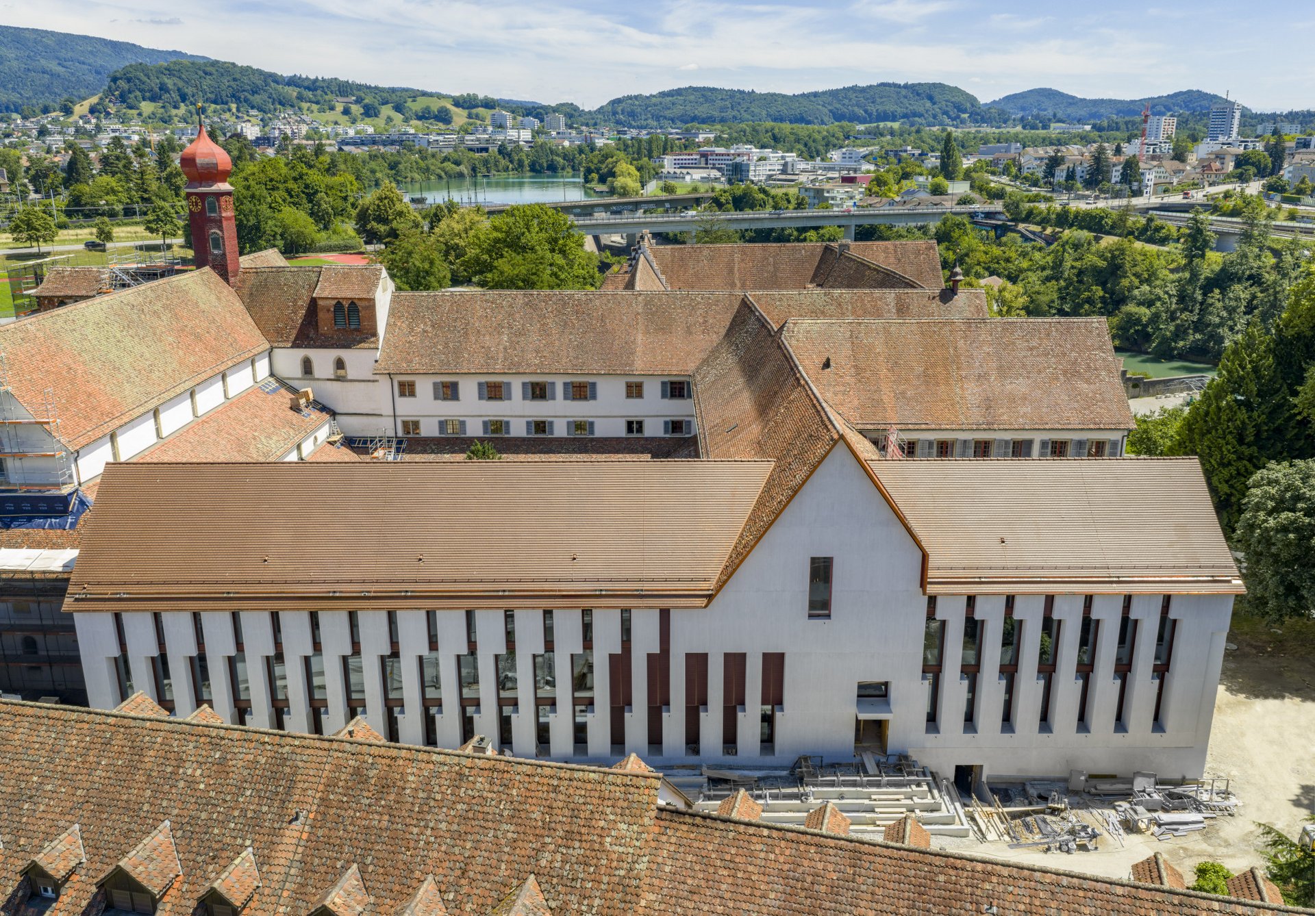 Neuer Westflügel mit drei Obergeschossen. Decken mittels sichtbarer Holzbetonverbunddecke auf massiven Aussenwänden aufgelegt. Decke im OG ist am Dach mittels Dachbinder aus Stabbuche aufgehängt. Steildach mit vorgefertigten Dachelementen. Innenwände im OG aus vorgefertigten Innenwandelementen.