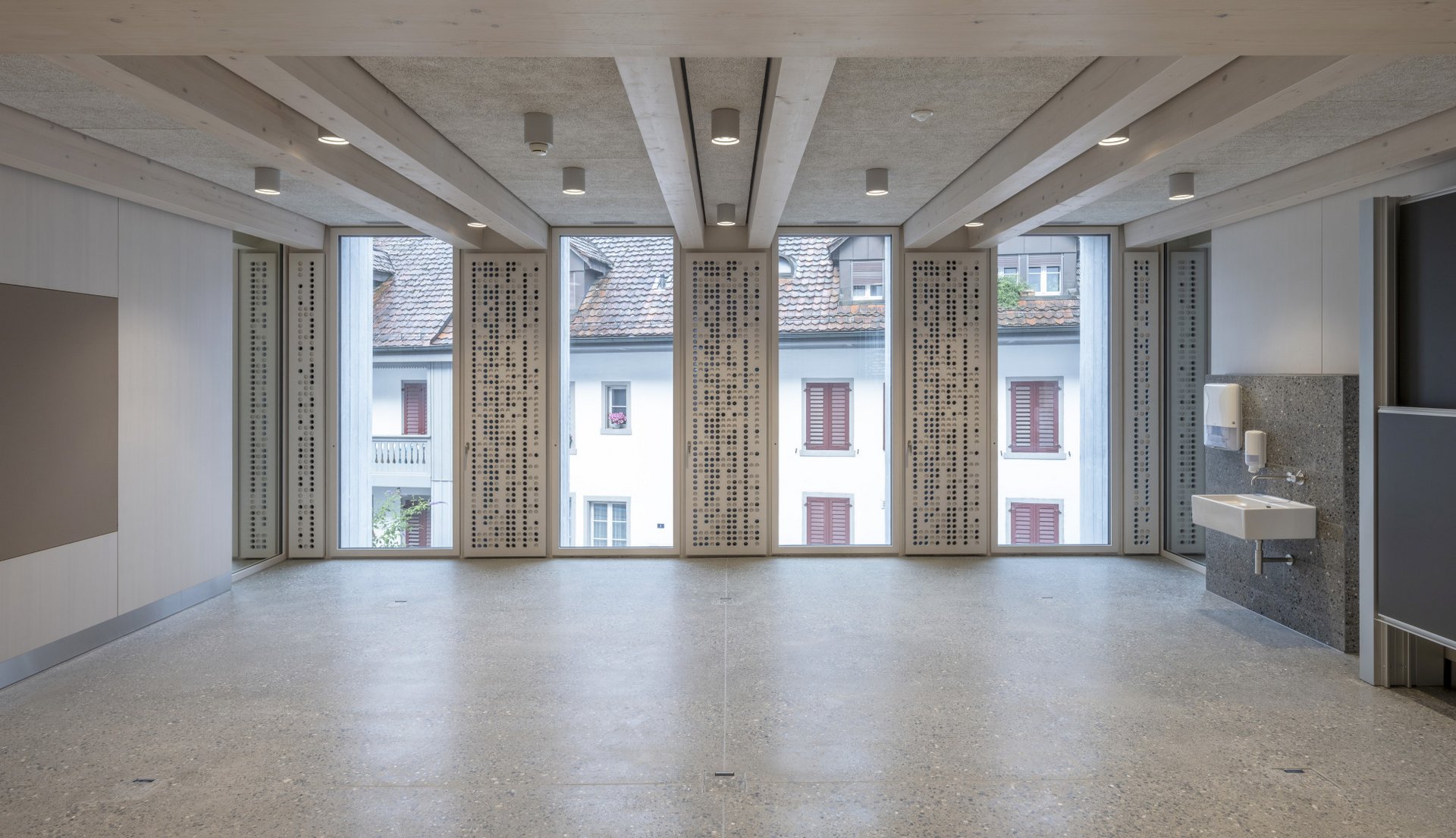 Highlight: Decke über Lernhalle mittels sichtbarer Holzbetonverbunddecke 11m frei gespannt.