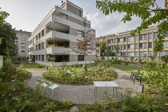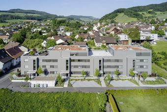 Hinterlüftete Fassade: Montage grossformatiger Faserzementplatten auf Holz-/Aluunterkonstruktion. Dämmung Mineralwolle mit auflaminiertem, schwarzem Glasvlies. Loggien als konventioneller Holzbau.