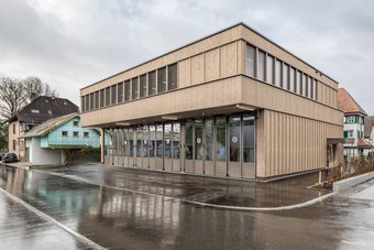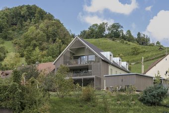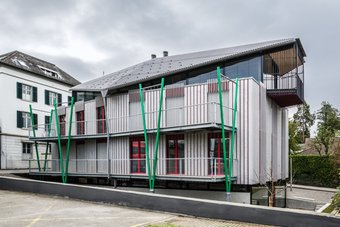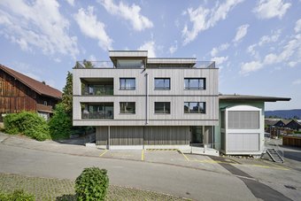 Dreigeschossiger Bau mit Anbau inkl. Attikageschoss. Fassadenbekleidung: Unterkonstruktion auf Mauerwerk, vertikale und horizontale Holzlattung in Kebony.