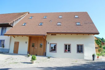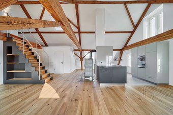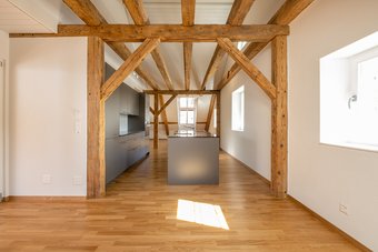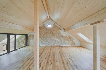 Umbau Scheunenteil zu Wohnraum: Neue Balkenlagen, Auflager mittels Stahlwinkel in Bruchsteinmauer befestigt. Kraftübertragung mit Betonnocken. Umbau Binder und Montage neuer Mittelpfetten.