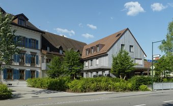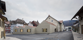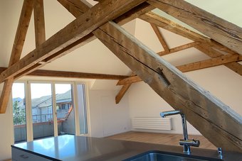 Neubau Wohnhaus: Zweigeschossiger Holzelementbau im Innenhof. Sämtliche Aussen- und Innenwände in Rahmenbauweise. Geschossdecken und Dach mit sichtbarer Balkenlage.