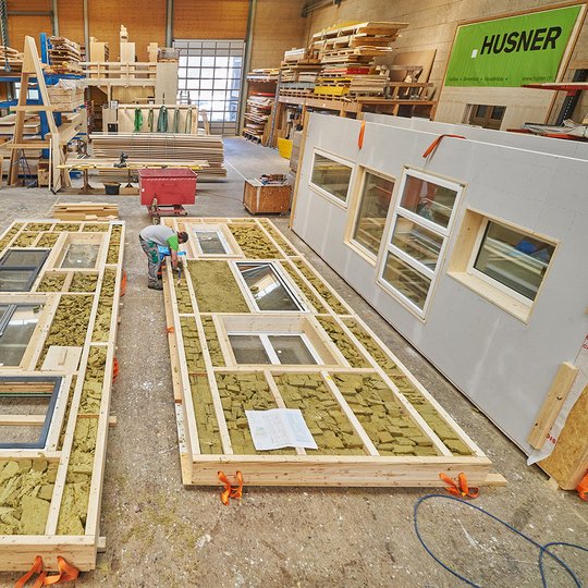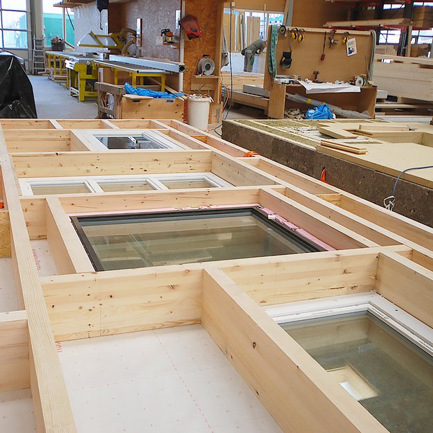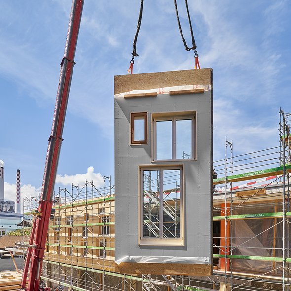 Alle rund 200 Fenster konnte das Architektenteam bei diversen Produzenten beschaffen. Infolge Mass- oder Farbfehlern wurden sie vor der Entsorgung bewahrt. Keines gleicht dem anderen - weder in der Form noch in der Farbe. Sie sind mal aussen-, mal innenliegend oder in der Wandmitte angeschlagen. Unser Team baut sie bereits im Werk in Frick in die Elemente ein.