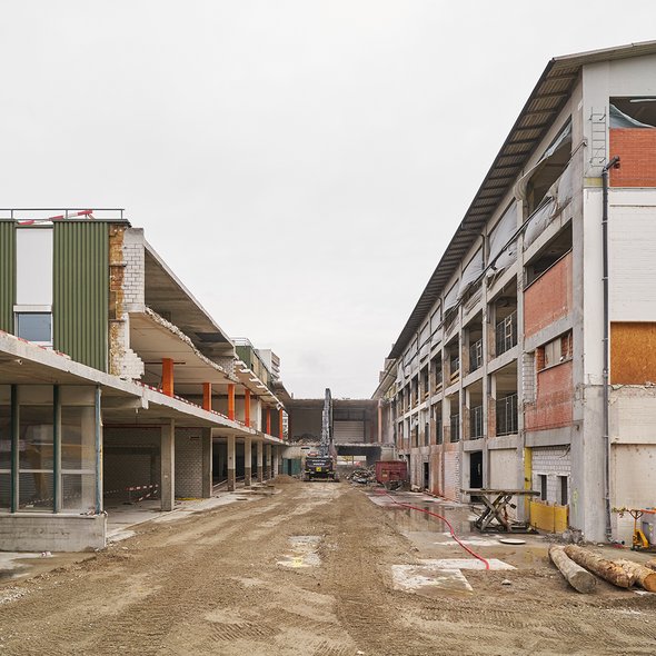 Nach umfangreichen Abbrucharbeiten ist am ehemaligen Verteilzentrum von Coop eine Schneise zwischen den Gebäuden 209 und 215 entstanden. Die neue Gebäudefassade des künftigen Gewerbe- und Kulturhauses baut HUSNER in Holzelementbauweise vorwiegend aus wiederverwendeten Baustoffen. Sie erstreckt sich ab der Decke des Erdgeschosses bis zum Dachrand über dem zweiten Obergeschoss.