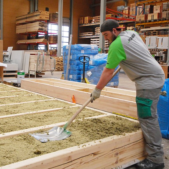Um Lufteinschlüsse zu vermeiden, werden die Zwischenräume mit neuem Steinwollgranulat gefüllt.
