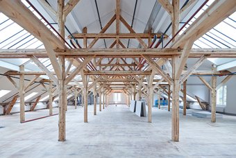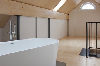 Vorgängige Bestandesaufnahme, Komplettabbruch und Neuaufbau des Dachstuhles. Innenwände und Geschossdecke in Holzelementbauweise. Wiederverwendung der alten Sparren für Galerieboden. Wiedereinbau des alten Tenntores im Wohnzimmer.